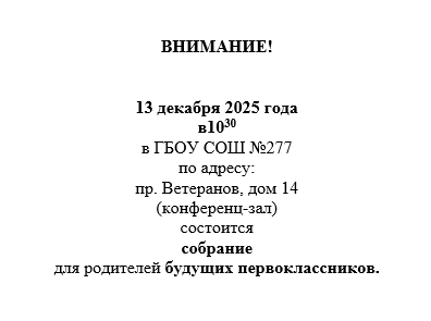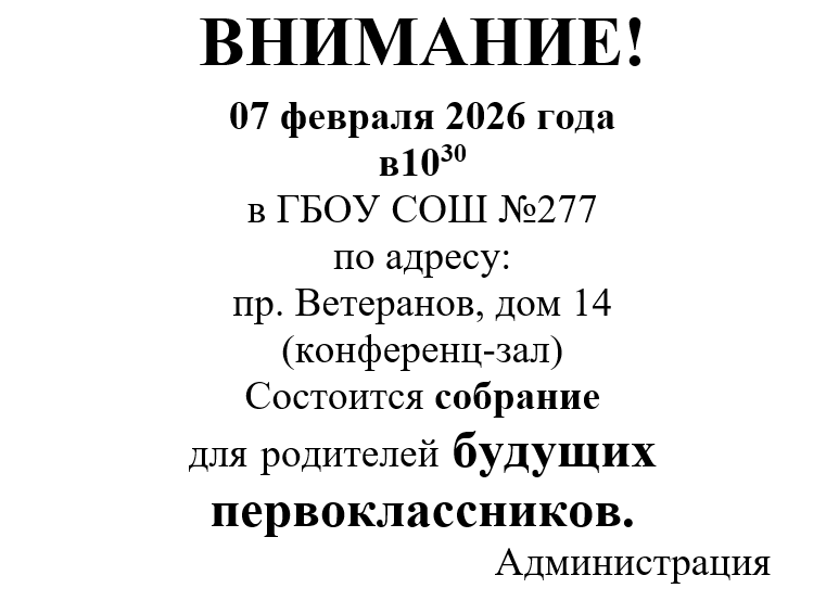Школа №277 – это средняя школа с полным днем пребывания детей. При организации учебного процесса мы ориентируемся на основные дисциплины образования, а также на внеурочные занятий и дополнительное образование. Таким образом , с самого юного возраста школьники имеют возможность развиваться в творческом и интеллектуальном планах в меру своих способностей.